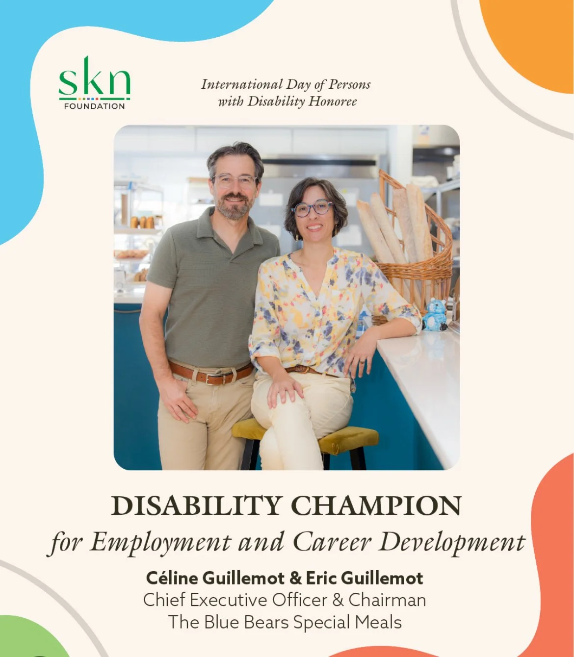 SKN Foundation’s awardees for Disability Champion for Employment and Career Development at the International Day of Persons with Disabilities will be Céline Guillemot and Eric Guillemot, CEO and chairman of The Blue Bears Special Meals. Founded in 2019 by Antoine and Gaud Yver, The Blue Bears was created to provide meaningful training and employment opportunities for individuals with intellectual and developmental disabilities. French natives Céline and Eric Guillemot took over leadership in 2024 and continued the mission of inclusion, skill development, and community. Drawing on Céline’s background in hospitality management and Eric’s passion for baking, they blend French culinary tradition with a purpose-driven approach, serving homemade dishes in a warm, vintage French setting. The Blue Bears employs and trains individuals with disabilities alongside their peers, fostering confidence, independence, and joy through shared work, food, and friendship.